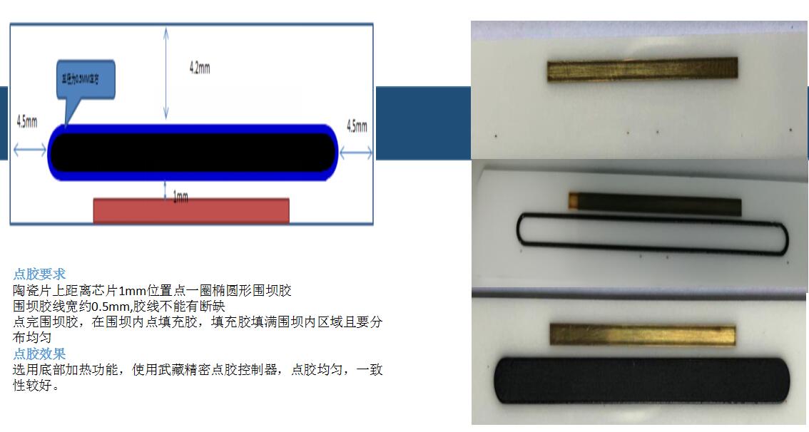 陶瓷片上距离芯片1mm位置点一圈椭圆形围坝胶